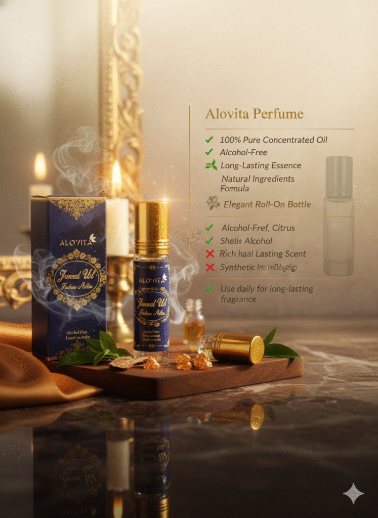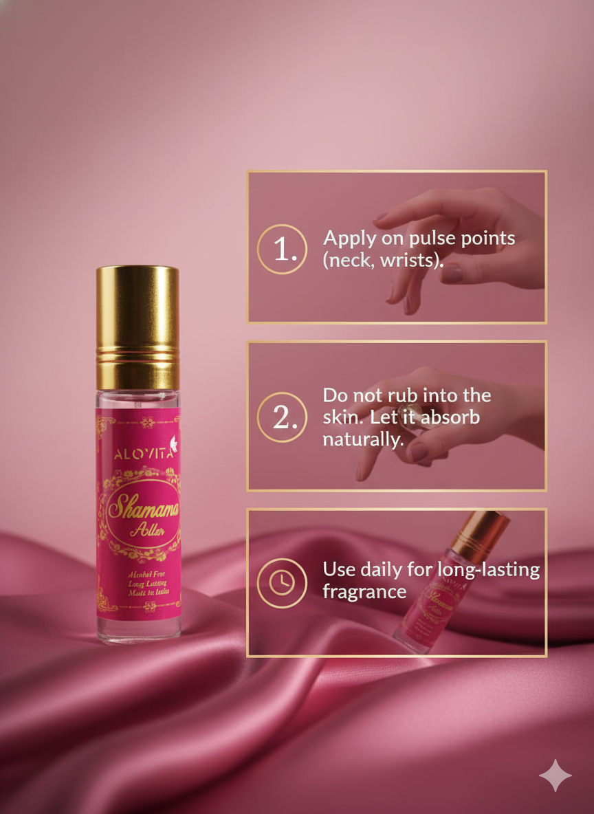 ALOVITA Shamama Attar एक premium alcohol-free roll-on perfume oil है, जिसे खास तौर पर long-lasting, rich और natural fragrance पसंद करने वालों के लिए बनाया गया है।